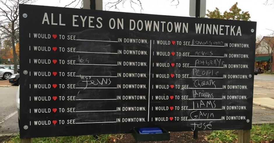 A suggestions chalkboard erected by the village of Winnetka has been used by a pair of 12-year-old boys who believe that the village would benefit from “less Jews” and also “KKK”, the initials of white supremacist group Ku Klax Klan.