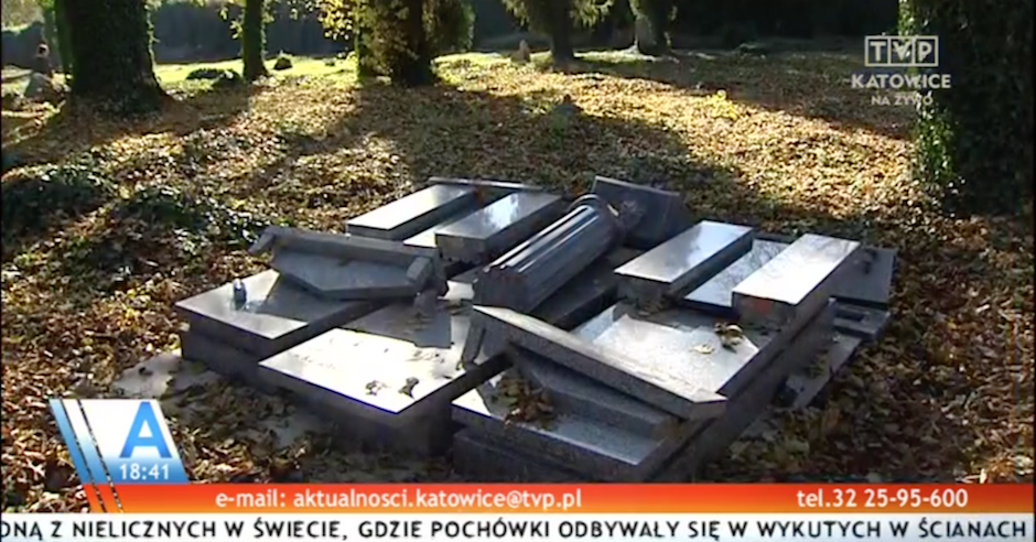 Nine graves at the Jewish cemetery in Bielsko-Biala, Poland, have been desecrated by vandals who toppled nine headstones. The graves targeted included that of prominent local architect Karol Korn, who was responsible for the design of many of Bielsko-Biala’s prominent buildings. His grave had been recently rebuilt in 2009, after the Nazis stole the original headstone during the Second World War.